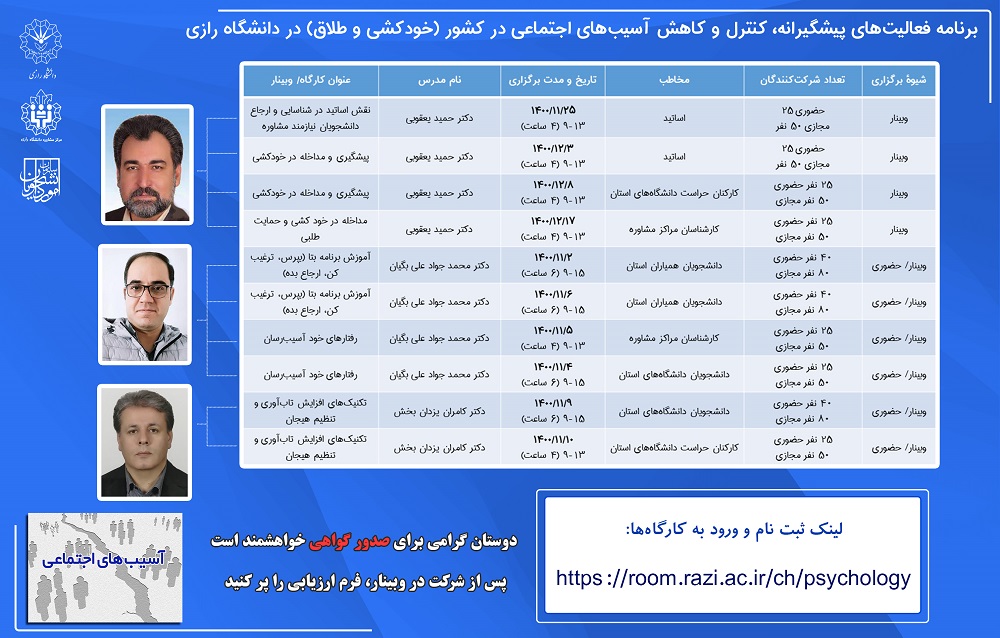 سلسله کارگاههای فعالیت های پیشگیرانه، کنترل و کاهش آسیبهای اجتماعی (خودکشی و طلاق) در کشور، توسط مرکز مشاوره دانشگاه رازی با همکاری کانون همیاران سلامت روان برگزار می شود.