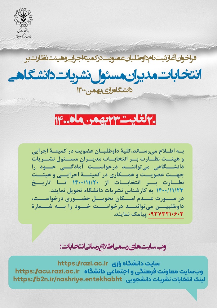 آغاز ثبت نام داوطلبان عضویت در کمیتۀ اجرایی و هیأت نظارت بر انتخابات مدیران مسئول نشریات دانشگاهی دانشگاه رازی
