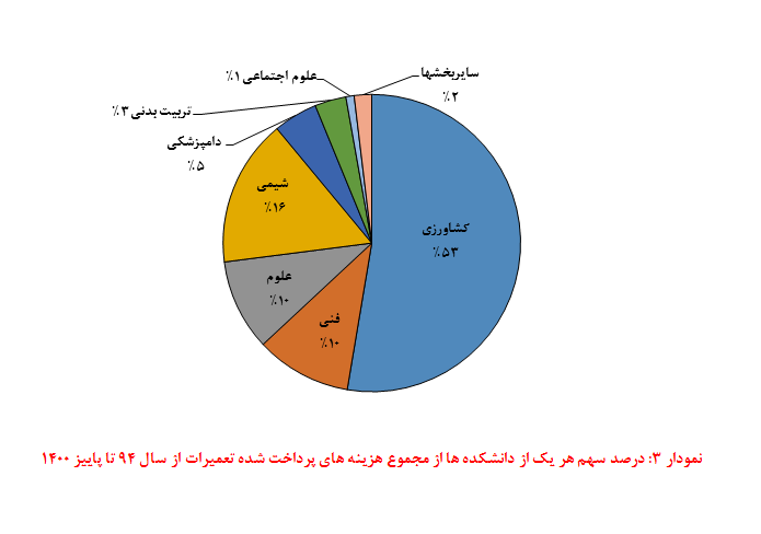 دکتر براتی افزود: عملکرد بخش تعمیرات آزمایشگاه مرکزی از سال 1394 تا پاییز 1400 در نمودارهای 1 تا 3 قابل مشاهده است. نمودار 1 تعداد تجهیزات تعمیر شده و نمودار 2 هزینه تعمیرات انجام شده را به تفکیک سالهای مختلف نشان میدهد که بیانگر تعمیر 923 با مجموع هزینه 8.190.000.000 ریال میباشد. همچنین نمودار 3 سهم هر یک از دانشکدههای دانشگاه را از هزینههای پرداختی تعمیرات از سال 94 تا کنون نمایش میدهد.