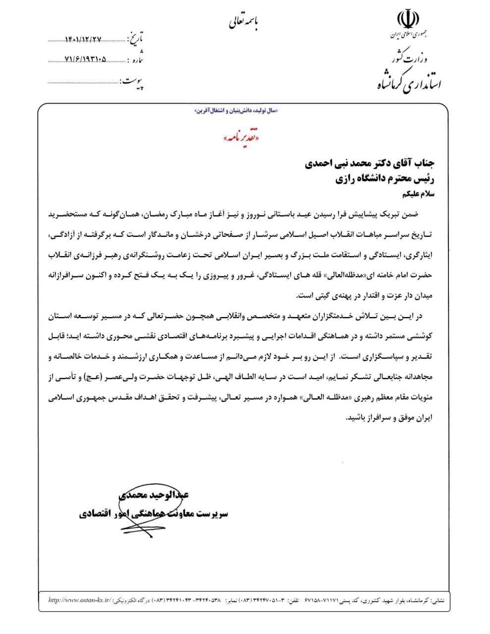 به گزارش روابط عمومی دانشگاه رازی، در نامه سرپرست معاونت هماهنگی امور اقتصادی استانداری کرمانشاه مورخ ۱۴۰۱/۱۲/۲۷، شماره ۷۱/۶/۱۹۳۱۰۵ آمده است: