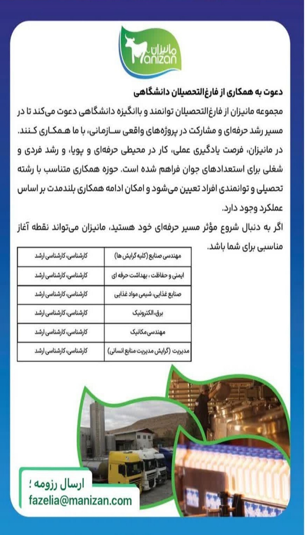 شرکت "مانیزان" از فارغ التحصیلان مقطع کارشناسی و کارشناسی ارشد در رشته های زیر دعوت به همکاری می نماید.: