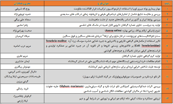 عناوین پروپوزال طرحهای پژوهشی شرکتکنندگان در نمایشگاه دائمی دانشگاه رازی که در جلسه مورخ 1400/03/30 شورای پژوهش و فناوری دانشگاه به تصویب رسید به شرح ذیل میباشد: