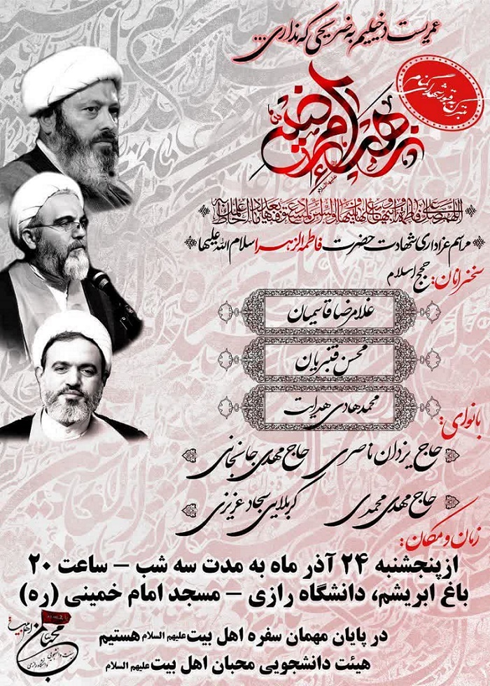 مراسم عزاداری شهادت حضرت فاطمه الزهرا(س) در مسجد امام خمینی(ره) دانشگاه رازی برگزار میشود.