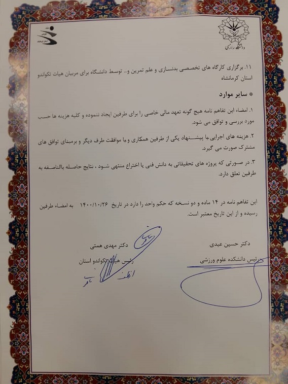 در پایان این نشست، تفاهمنامه همکاری علمی و ورزشی میان دانشکده علوم ورزشی دانشگاه رازی و هیأت تکواندو استان کرمانشاه به امضا رسید.