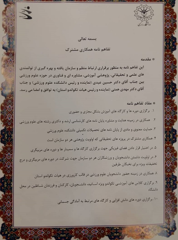 تفاهمنامه همکاری علمی و ورزشی میان دانشکده علوم ورزشی دانشگاه رازی و هیأت تکواندو استان کرمانشاه به امضا رسید.