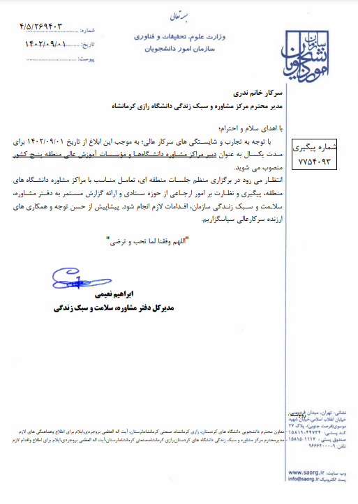 انتصاب دبیر مراکز مشاوره دانشگاهها و موسسات آموزش عالی منطقه 5 کشور - پرتال اصلی دانشگاه رازی