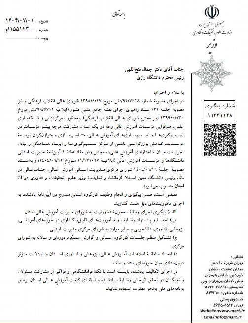 در اجرای مصوبه شماره ۷۴۱۸/۹۵/دش مورخ 1395/04/27 شورای عالی انقلاب فرهنگی و نیز مصوبه جلسه ۱۳۱ ستاد راهبری اجرای نقشه جامع علمی کشور (ابلاغیه ۵۷۱۱/۹۹/دش مورخ ۳۰/۰۴/۱۳۹۹ دبیر محترم شورای عالی انقلاب فرهنگی)، بهمنظور تمرکززدایی و شبکهسازی علمی، همافزایی مؤسسات آموزش عالی واقع در یک استان، مشارکت هرچه بیشتر مؤسسات در تصمیمگیریها و تصمیمسازیهای آموزش عالی، متناسبسازی و متوازن کردن توسعه مؤسسات، کاهش بوروکراسی ناشی از تمرکز تصمیمگیریها و ایجاد هماهنگی و تبادل تجربیات میان ساختارهای آموزش عالی، همچنین وفق مفاد «ماده ۱ آییننامه مدیریت استانی دانشگاهها و مؤسسات آموزش عالی» (ابلاغیه 11/131027مورخ 1404/06/12) و به استناد مصوبه جلسه 1404/06/16 شورای مرکزی مدیریت استانی آموزش عالی، جناب عالی در مقام رئیس دانشگاه معین استان کرمانشاه و نماینده وزیر علوم، تحقیقات و فناوری در آن استان منصوب میشوید.
