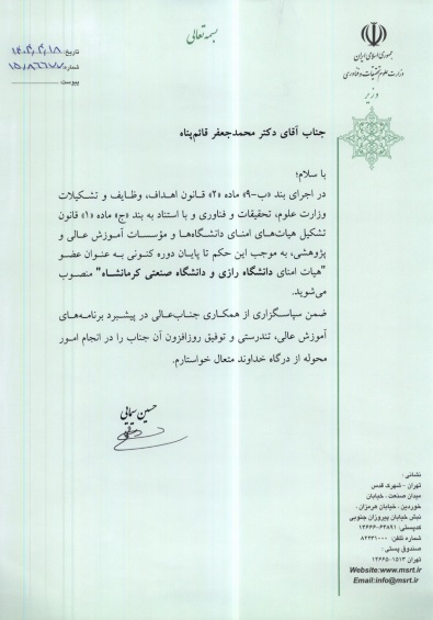 در اجرای بند «ب- ۹» ماده «۲» قانون اهداف، وظایف و تشکیلات وزارت علوم، تحقیقات و فناوری و با استناد به بند «ج» ماده «۱» قانون تشکیل هیاتهای امنای دانشگاهها و موسسات آموزش عالی و پژوهشی، به موجب این حکم تا پایان دوره کنونی به عنوان عضو هیات امنای دانشگاه رازی و دانشگاه صنعتی کرمانشاه منصوب میشوید. ضمن سپاسگزاری از همکاری جنابعالی در پیشبرد برنامههای آموزش عالی، تندرستی و توفیق روز افزون آن جناب را در انجام امور محوله از درگاه خداوند متعال خواستارم.