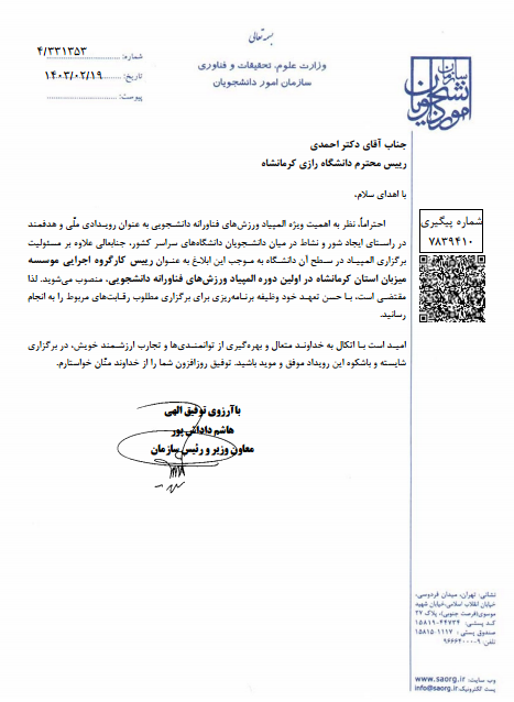 احتراما، نظر به اهمیت ویژه المپیاد ورزشهاي فناورانه دانشـجویی به عنوان رویدادي ملی و هدفمند در راستاي ایجاد شور و نشاط در میان دانشجویان دانشگاههاي سراسر کشور، جنابعالی علاوه بر مسئولیت برگزاري المپیاد در سـطح آن دانشـگاه به موجب این ابلاغ به عنوان رئیس کارگروه اجرایی موسسه میزبان استان کرمانشاه در اولین دوره المپیاد ورزشهاي فناورانه دانشجویی، منصوب میشوید. لذا مقتضی است، بـا حسن تعهـد خود وظیفه برنـامهریزي براي برگزاري مطلوب رقـابتهاي مربوط را به انجام رسانید. امید است بـا اتکال به خداونـد متعال و بهرهگیري از توانمنديها و تجارب ارزشمند خویش، در برگزاري شایسته و باشکوه این رویداد موفق و مؤید باشید. توفیق روزافزون شما را از خداوند منّان خواستارم.
