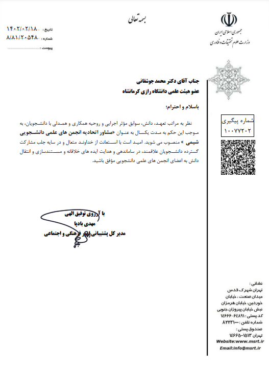 نظر به مراتب تعهـد، دانش، سوابق مؤثر اجرایی و روحیه همکاری و همـدلی با دانشـجویان، به مـوجب این حکم به مـدت یکسـال به عنـوان «مشاور اتحادیه انجمنهای علمی دانشـجویی شیمی» منصـوب میشوید. امیـد است با اســتعانت ازخداونـد متعال و درسایه جلب مشارکت گسترده دانشــجویان علاقمند، درساماندهی و هدایت ایدههای خلاقانه و مســتندسازی و انتقال دانش به اعضای انجمنهای علمی دانشجویی مؤفق باشید.