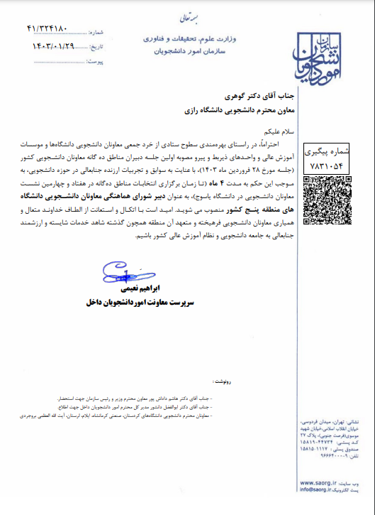 احتراما، در راسـتای بهرهمندی سطوح ستادی ازخرد جمعی معاونان دانشجویی دانشگاهها و مؤسسات آموزش عالی و واحـدهای ذیربط و پیرو مصوبه اولین جلسه دبیران مناطق ده گانه معاونان دانشجویی کشور (جلسه مورخ 28 فروردین ماه1403، (با عنایت به سوابق و تجربیات ارزنده جنابعالی در حوزه دانشجویی، به موجب این حکم به مـدت 4 ماه (تـا زمان برگزاری انتخابات مناطق دهگانه در هفتاد وچهارمین نشست معاونان دانشجویی در دانشگاه یاسوج)، به عنوان دبیر شورای هماهنگی معاونان دانشجویی دانشگاههای منطقه پنـج کشور منصوب میشویـد. امید است با اتکال و استعانت از الطاف خداوند متعال و همیاري معاونان دانشجویی فرهیخته و متعهد آن منطقه همچون گذشته شاهد خدمات شایسته و ارزشمند جنابعالی به جامعه دانشجویی و نظام آموزش عالی کشور باشیم.
