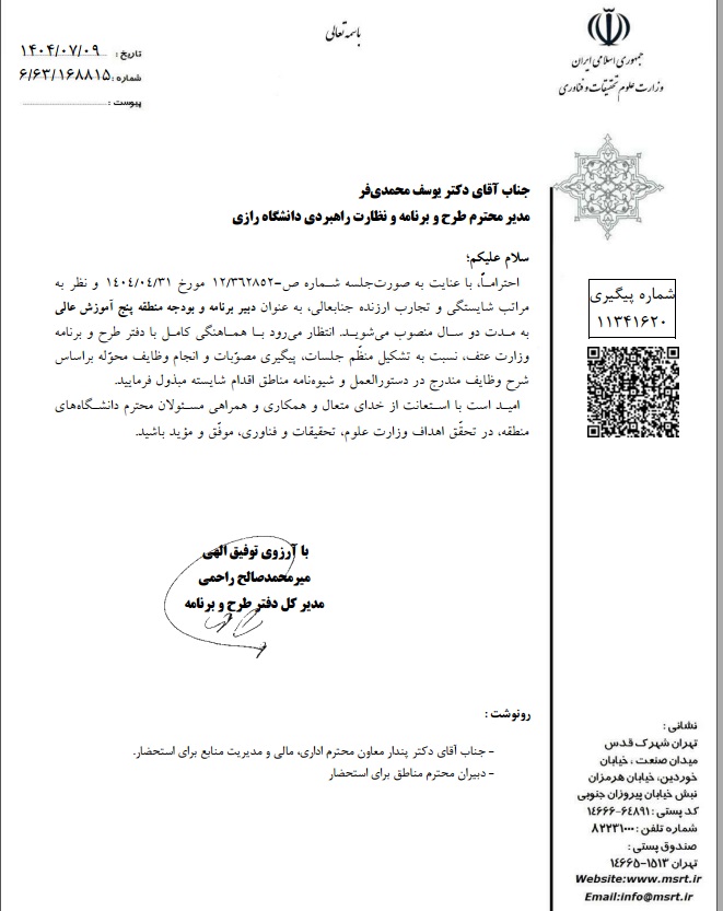 احتراماً، با عنایت به صورتجلسه شماره ص-۳۶۲۸۵۲/۱۲ مورخ ۱۴۰۴/۰۴/۳۱ و نظر به مراتب شایستگی و تجارب ارزنده جنابعالی، به عنوان «دبیر برنامه و بودجه منطقه پنج آموزش عالی» به مدت دو سال منصوب میشوید. انتظار میرود با هماهنگی کامل با دفتر طرح و برنامه وزارت عتف، نسبت به تشکیل منظم جلسات، پیگیری مصوبات و انجام وظایف محوله بر اساس شرح وظایف مندرج در دستورالعمل و شیوهنامه منطقه، اقدام شایسته مبذول فرمایید. امید است با استعانت از خداوند متعال و همکاری و همراهی مسئولان محترم دانشگاههای منطقه، در تحقق اهداف وزارت علوم، تحقیقات و فناوری، موفق و مؤید باشید.
