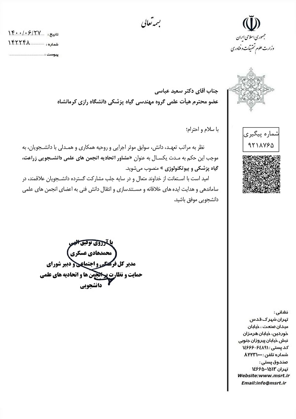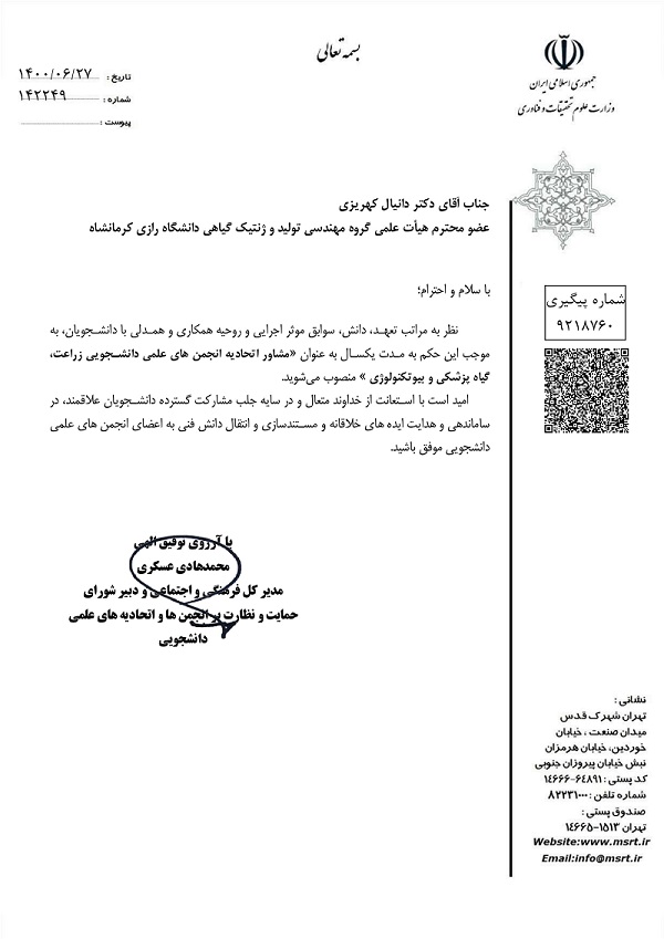 به گزارش روابط عمومی دانشگاه رازی، مهندس محمدهادي عسکري مدیرکل فرهنگی و اجتماعی و دبیر شوراي حمایت و نظارت بر انجمنها و اتحادیههای علمی دانشجویی وزارت علوم، تحقیقات و فناوری، در احکام جداگانهای، دکتر دانیال کهریزی عضو هیئت علمی گروه مهندسی تولید و ژنتیک گیاهی و دکتر سعید عباسی عضو هیئتعلمی گروه مهندسی گیاهپزشکی دانشگاه رازی را برای مدت یکسال به عنوان «مشاور اتحادیه انجمنهای علمی دانشجویی زراعت، گیاه پزشکی و بیوتکنولوژی» منصوب کرد.