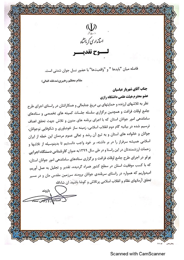 به گزارش روابط عمومی دانشگاه رازی، لوح تقدیر دستگاه اجرایی برتر در اجرای طرح جامع اوقات فراغت و برگزاری ستادهای ساماندهی امور جوانان استان کرمانشاه از سوی استاندار کرمانشاه به دکتر شهریار عباسیان مدیر امور تربیت بدنی دانشگاه رازی اهدا گردید.