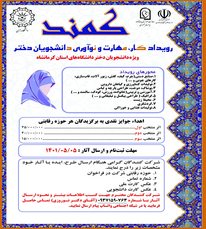 بر اساس اعلام معاون فرهنگی و اجتماعی دانشگاه رازی؛ اولین رویداد کمند با هدف کار، مهارت و نوآوری دانشجویان دختر دانشگاههای استان کرمانشاه با همکاری معاونت امور زنان و خانواده ریاست جمهوری و وزارت علوم، تحقیقات و فناوری برگزار میشود. هدف از برگزاری این رویداد، آشنایی و آمادهسازی دانشجویان دختر برای ورود به بازار کار و کارآفرینی است و تمام دانشجویان دختر دانشگاههای استان کرمانشاه میتوانند از طریق راه ارتباطی اعلام شده در این رویداد شرکت کنند.