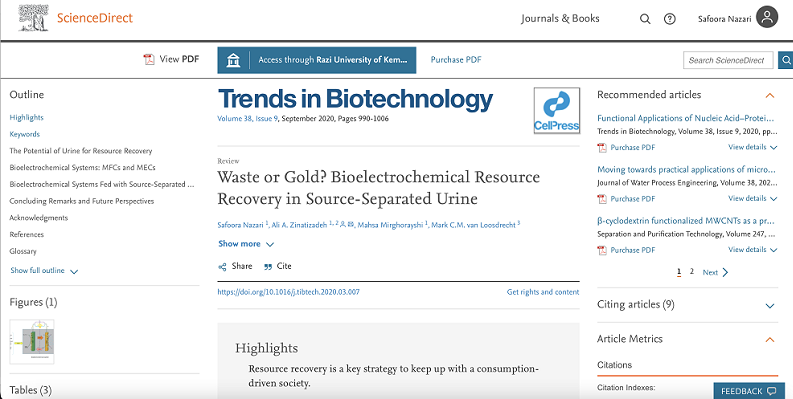 در سال ۲۰۲۰ در نشریه بسیار معتبر Trends in Biotechnology (IF=19.536) توسط تیمی از پژوهشگران آزمایشگاه تحقیقات کاربردی آب و فاضلاب و گروه بیوتکنولوژی دانشگاه صنعتی دلفت به سرپرستی دکتر زینتیزاده به چاپ رسید.