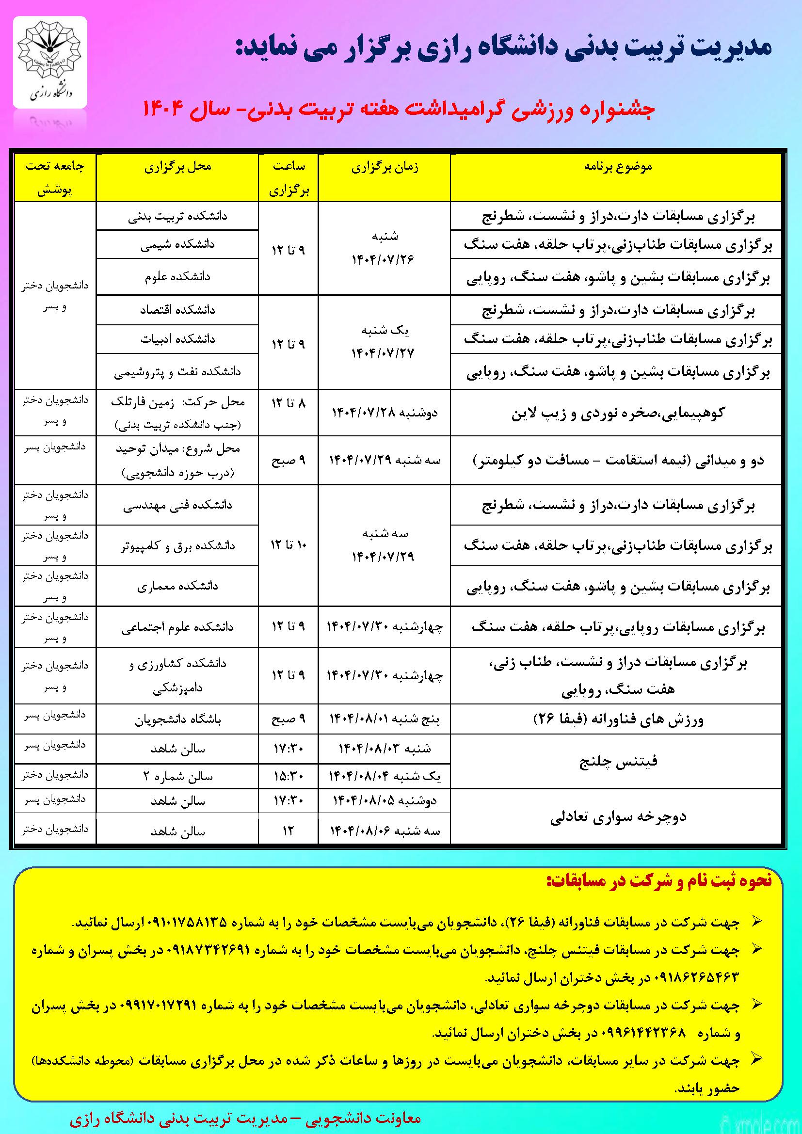 برنامه جشنواره ورزشی دانشجویان به مناسبت گرامیداشت هفته تربیت بدنی - پرتال اصلی دانشگاه رازی