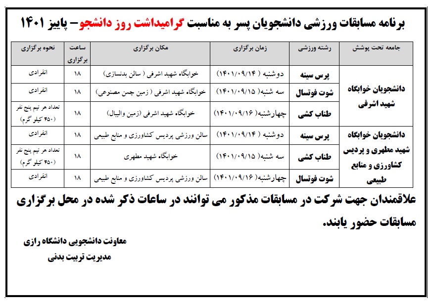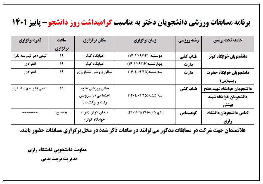 برنامه مسابقات ورزشی دانشجویان در پاییز 1401 اعلام شد - پرتال اصلی دانشگاه رازی