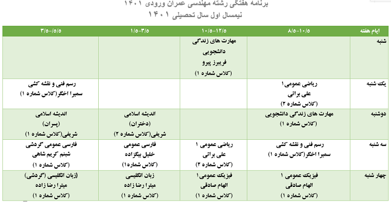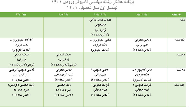 برنامه هفتگی رشتههای مهندسی عمران و مهندسی کامپیوتر ورودی 1401 - دانشکده فنیمهندسی اسلام آباد غرب