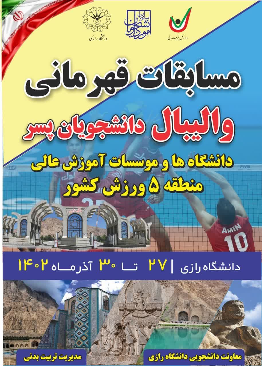 مسابقات والیبال دانشجویان پسر دانشگاهها و موسسات آموزش عالی منطقه 5 ورزش کشور (کسب سهمیه شانزدهمین المپیاد فرهنگی ورزشی دانشجویان سراسر کشور) از تاریخ 27 آذر ماه سال 1402 تا 30 آذر 1402 به میزبانی دانشگاه رازی برگزار میگردد.