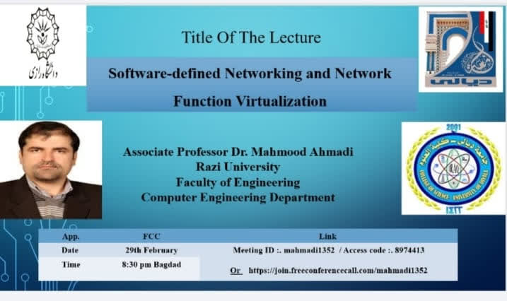در راستای اجرایی نمودن یادداشتتفاهم، دکتر محمود احمدی سخنرانی مجازی برای بالغ بر ۸۰ نفر از اساتید و دانشجویان دانشگاه دیاله با عنوان "Software Defined Networking and Network Function Virtualization" برگزار نمودند.