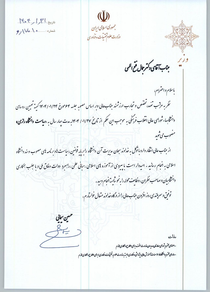 حکم دکتر «جمال فتح اللهی» به عنوان رئیس دانشگاه رازی در نشست شورای عالی انقلاب فرهنگی تأیید شد.