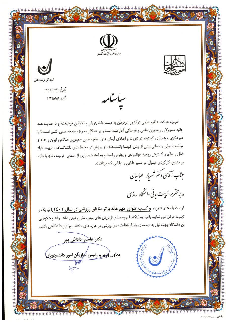 شایان ذکر است، بر اساس ارزیابیهای به عمل آمده توسط اداره کل تربیتبدنی سازمان امور دانشجویان، عملکرد مطلوب و شایسته مدیریت تربیتبدنی دانشگاه رازی در سال ۱۴۰۱ به عنوان دبیرخانه منطقه ۵ در حوزه ورزش، مورد تقدیر قرار گرفت.