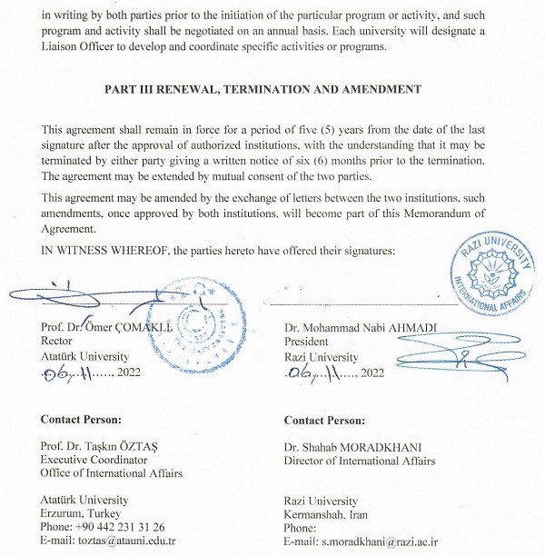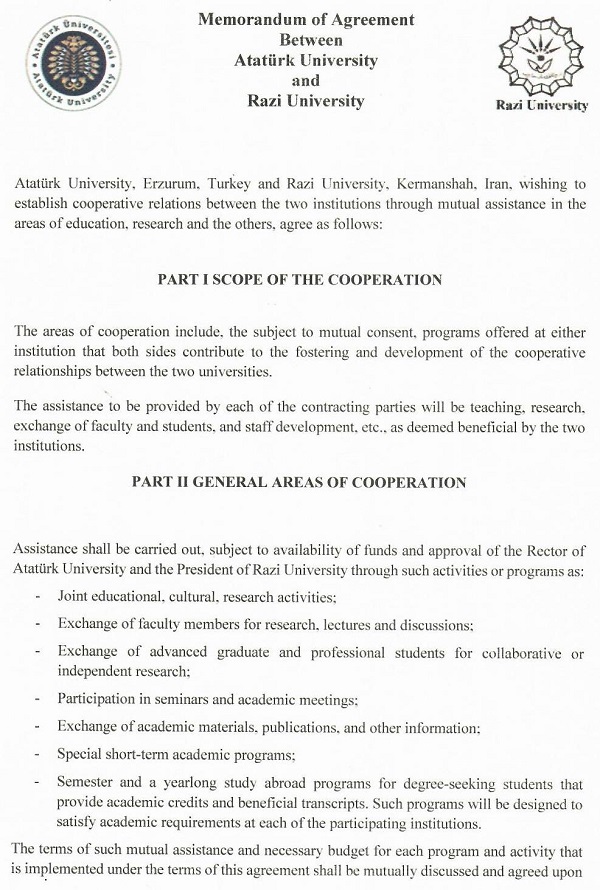 در راستای گسترش همکاریهای علمی بینالمللی، دانشگاههای رازی و آتاتورک تفاهم نامه همکاری امضا کردند.