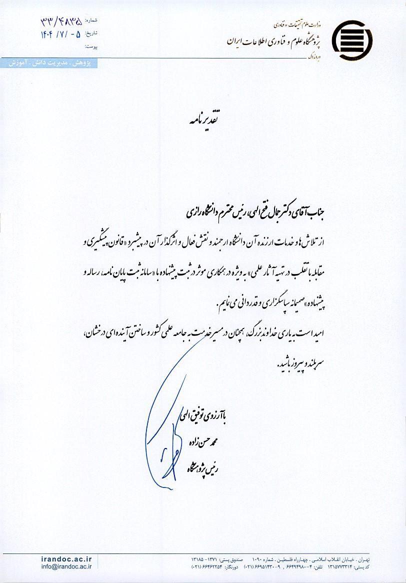 رئیس پژوهشگاه علوم و فناوری اطلاعات ایران در نامهای، از همکاری مناسب دانشگاه رازی در پیشبرد قانون پیشگیری و مقابله با تقلب در تهیه آثار علمی تقدیر کرد.