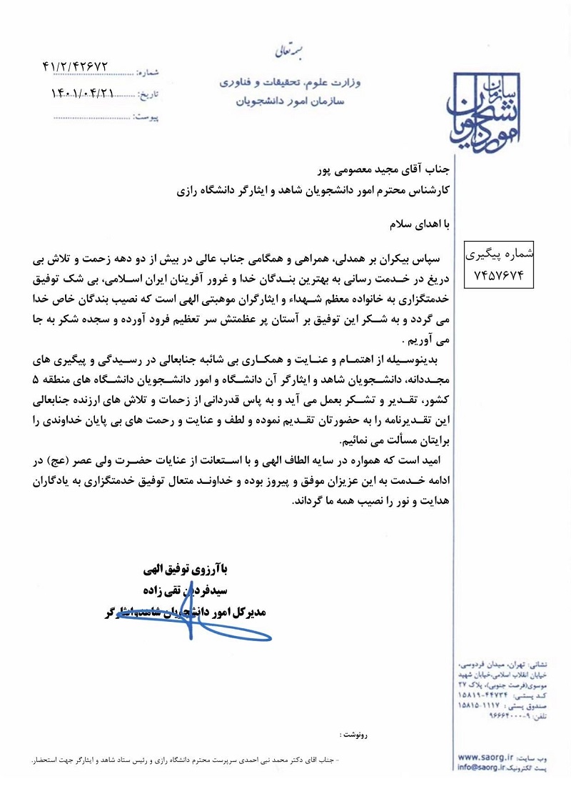 بدین وسیله از اهتمام و عنایت و همکاری بیشائبه جنابعالی در رسیدگی و پیگیریهای مجدانه دانشجویان شاهد و ایثارگر آن دانشگاه و امور دانشجویان دانشگاههای منطقه ۵ کشور، تقدیر و تشکر به عمل میآید و به پاس قدردانی از زحمات و تلاشهای ارزنده جنابعالی این تقدیرنامه را به حضورتان تقدیم نموده و لطف و عنایت و رحمتهای بیپایان خداوندی را برایتان مسألت مینمائیم.