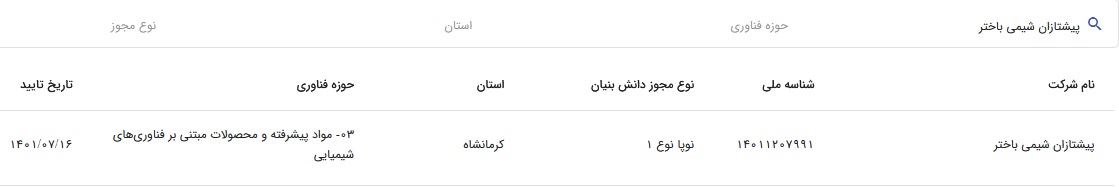 دکتر شهرام شریف نیا در این خصوص اظهار داشت: شرکت دانش بنیان "پیشتازان شیمی باختر" در گروه نوپا نوع 1 میباشد و در مورخ 16 مهر ماه 1401 این تأییدیه را دریافت کرده است.
