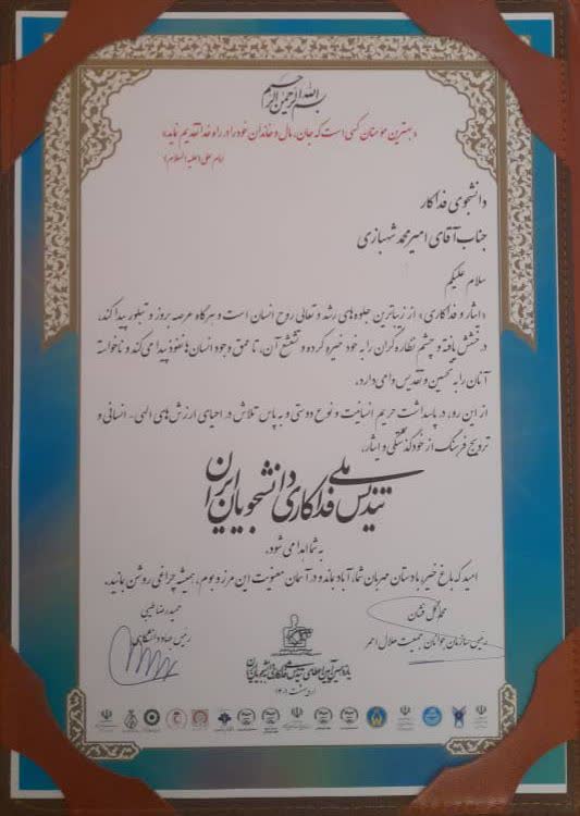 به گزارش روابط عمومی دانشگاه رازی به نقل از معاونت فرهنگی و اجتماعی دانشگاه، امیرمحمد شهبازی دانشجوی مهندسی برق دانشگاه رازی و عضو فعال و باسابقۀ کانونهای فرهنگی دانشگاه، موفق به کسب عنوان دانشجوی فداکار کشور و ششمین تندیس ملی شد.