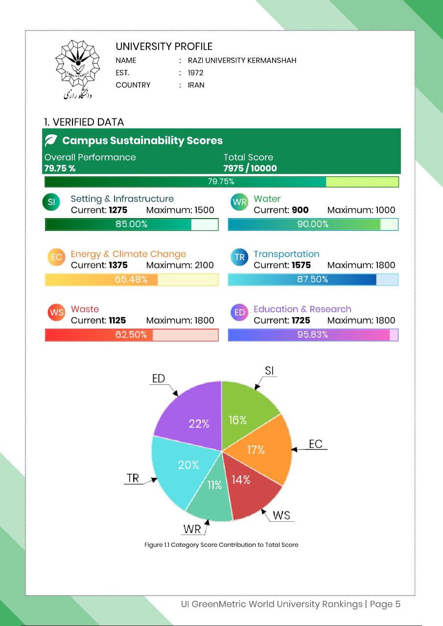 دانشگاه رازی در این حوزهها با اتخاذ سیاستها و برنامههای راهبردی، به دستاوردهای قابلتوجهی نائل شده است. از جمله موفقیتهای ملی دانشگاه در این رتبهبندی میتوان به کسب رتبه اول در آموزش و پژوهش محیط زیستی و رتبه سوم در توسعه زیرساختهای سبز اشاره کرد.