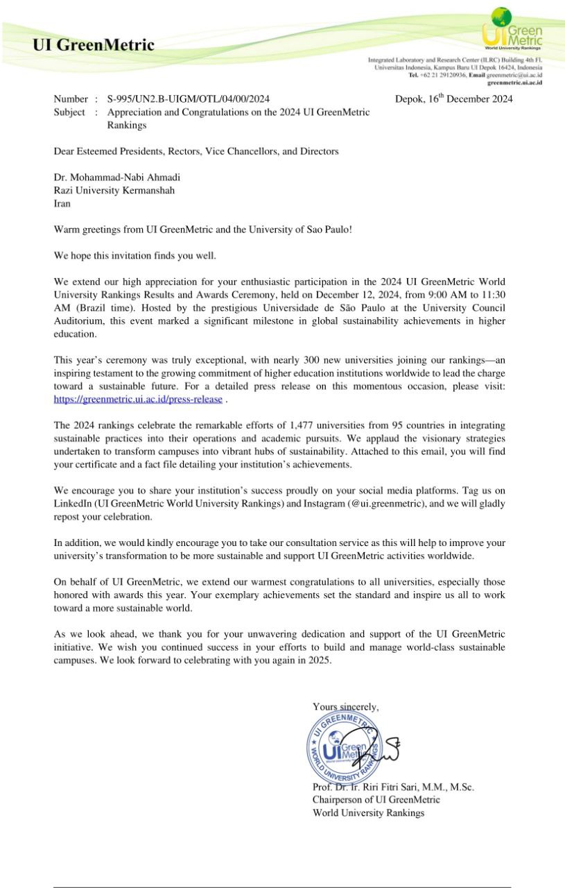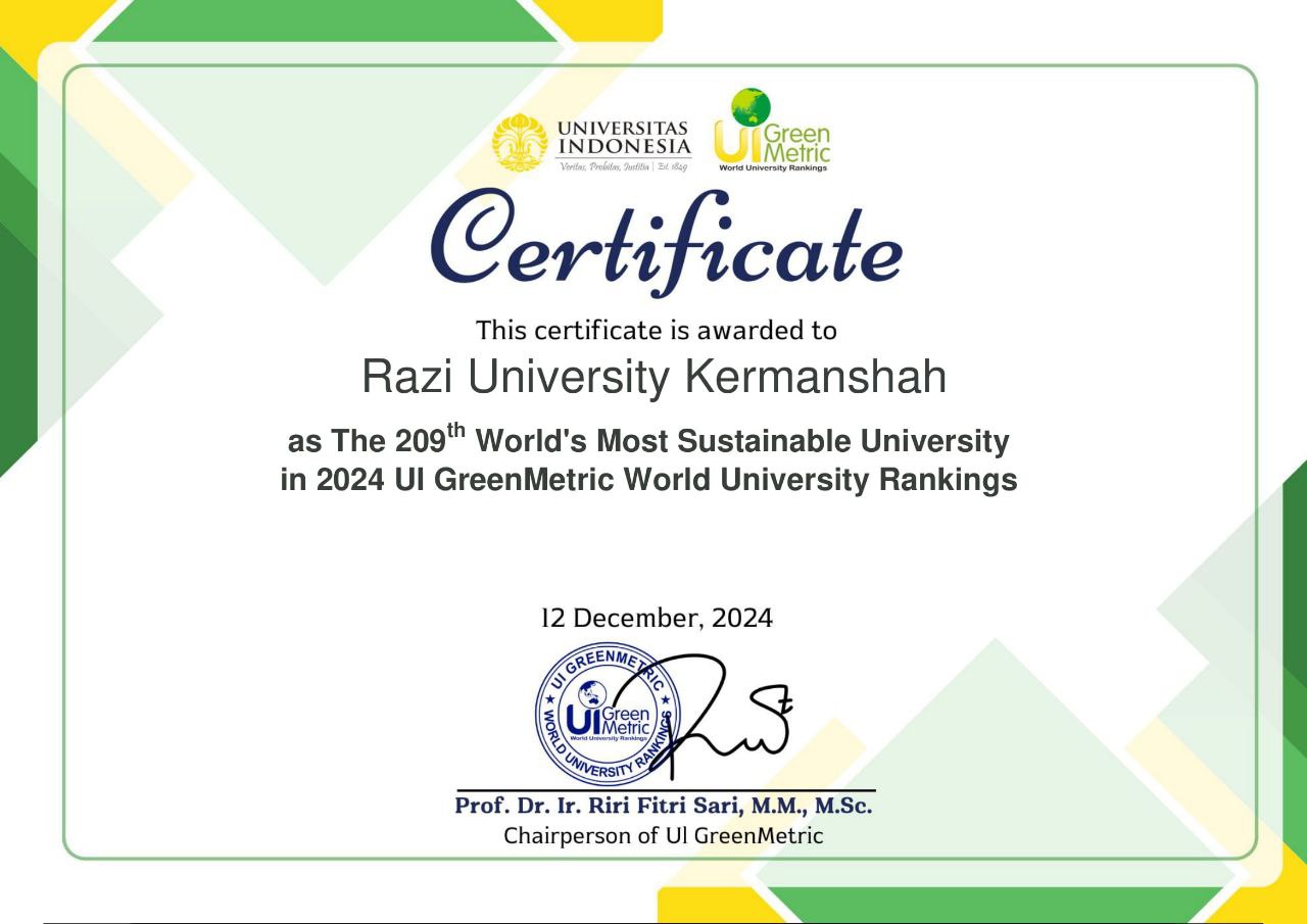 دانشگاه رازی در رتبهبندی بینالمللی گرین متریک ۲۰۲۴، رتبه دوم را در میان دانشگاههای کشور و رتبه ۲۰۹ جهانی را در میان ۱۴۷۷ دانشگاه دنیا که توانستهاند شاخصهای لازم را برای حضور در این رقابت به دست آورند، کسب کرد.