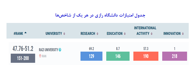 مدیر امور پژوهشی دانشگاه افزود: دانشگاه رازی موفق شده است؛ رتبه 200-151 را در بین کلیه دانشگاههای کشورهای اسلامی و رتبه دهم را در بین دانشگاههای جامع کشور بدست آورد.