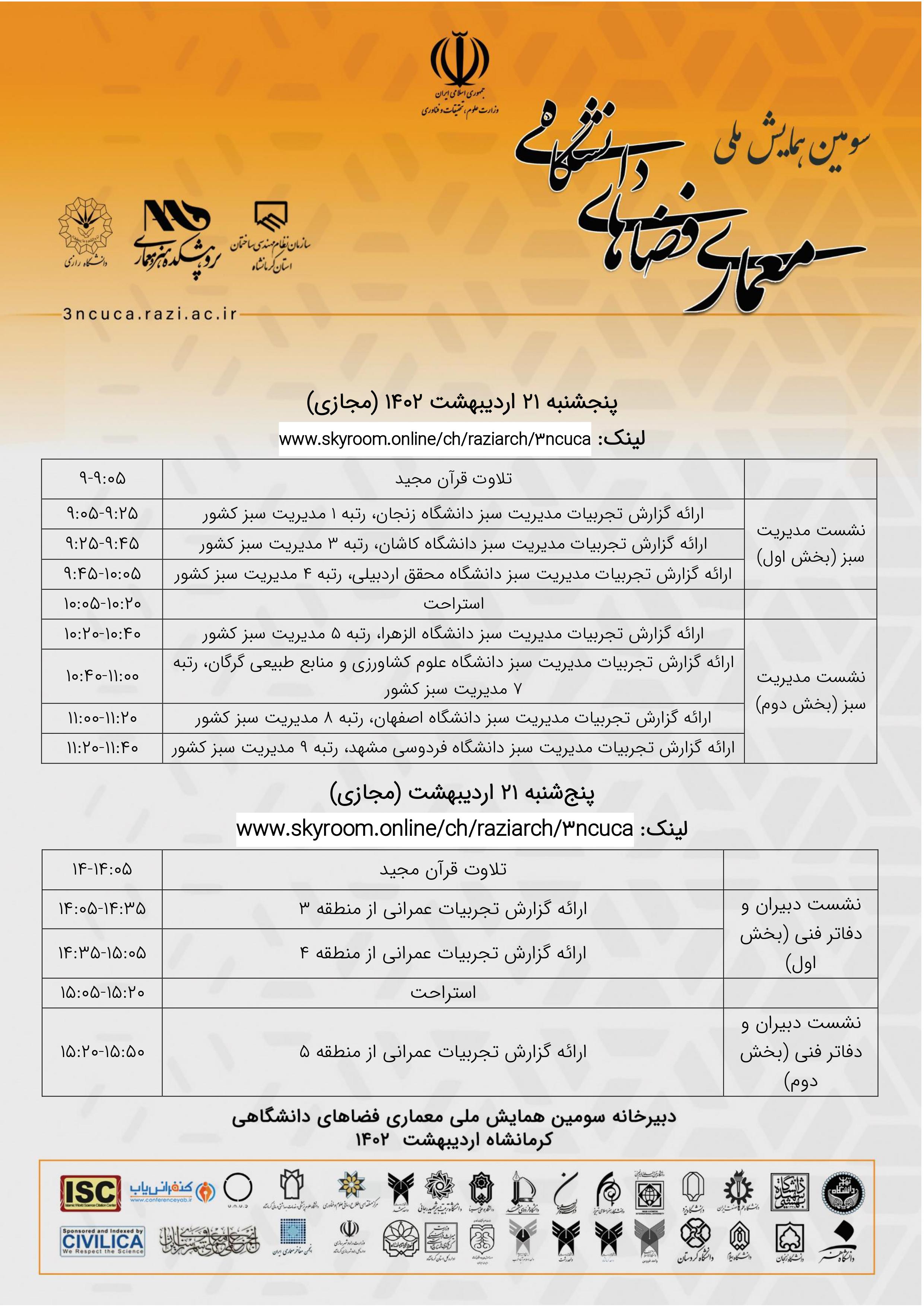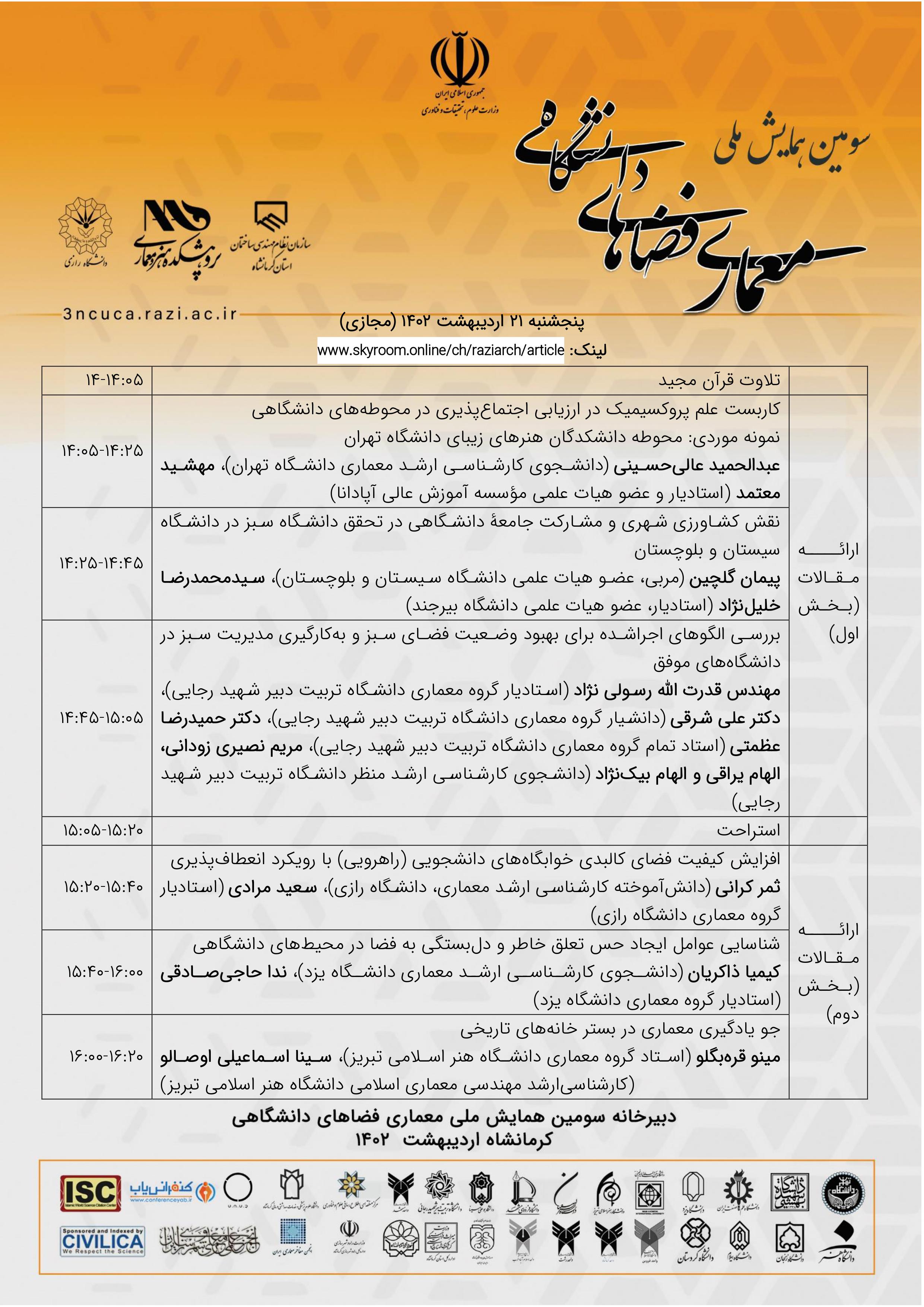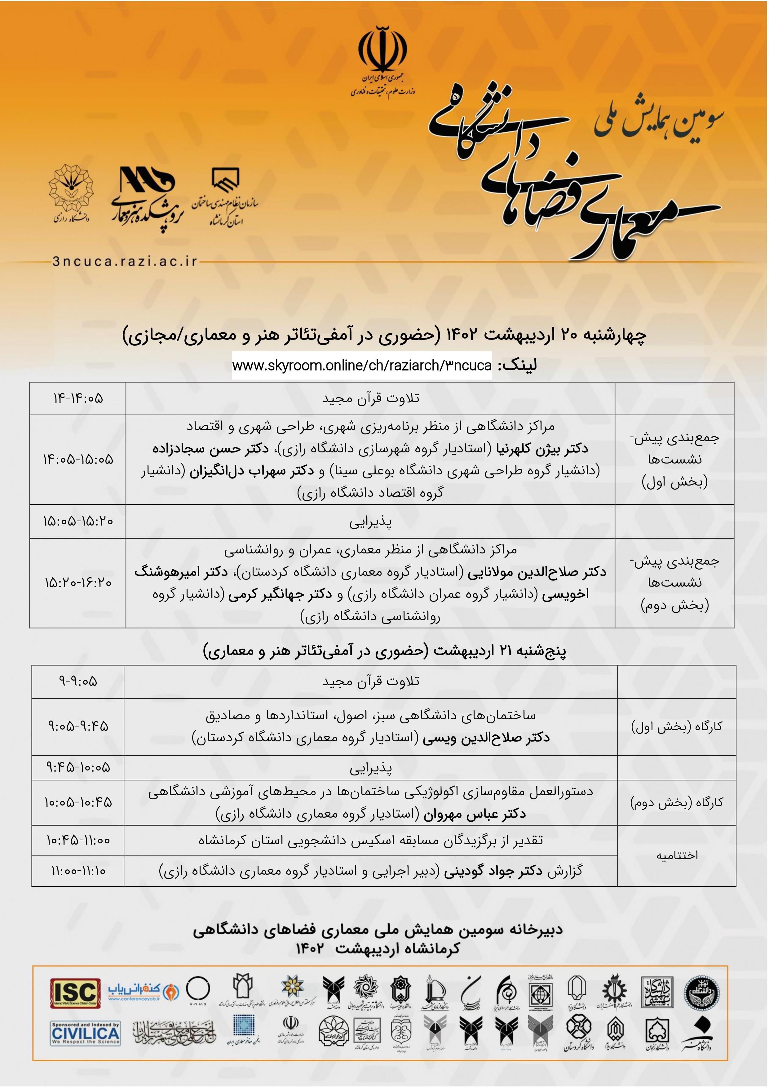 این همایش در روزهای چهارشنبه و پنجشنبه 20 و 21 اردیبهشتماه 1402 میزبان علاقهمندان است. همچنین امکان حضور مجازی در این همایش (در بستر اسکایروم) به آدرس https://www.skyroom.online/ch/raziarch/3ncuca فراهم است.