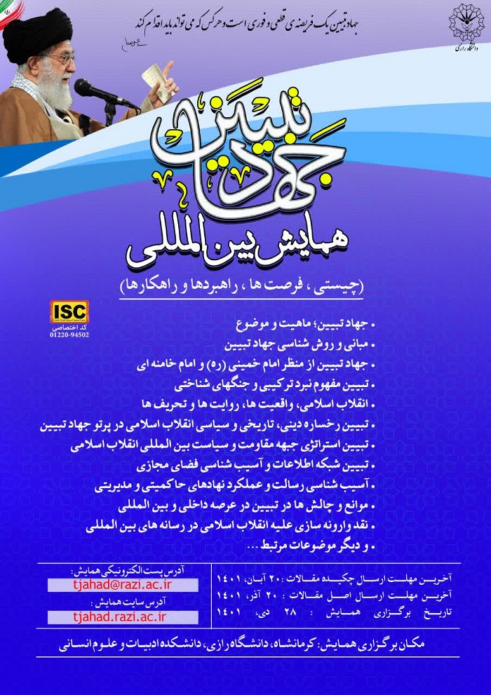 دانشگاه رازی در راستای عمل به منّویات مقام معظم رهبری (مدظله العالی) مبنی بر ضرورت "جهاد تبیین"، همایش بینالمللی با عنوان «جهاد تبیین؛ چیستی، فرصتها، راهبردها و راهکارها» را برگزار میکند.