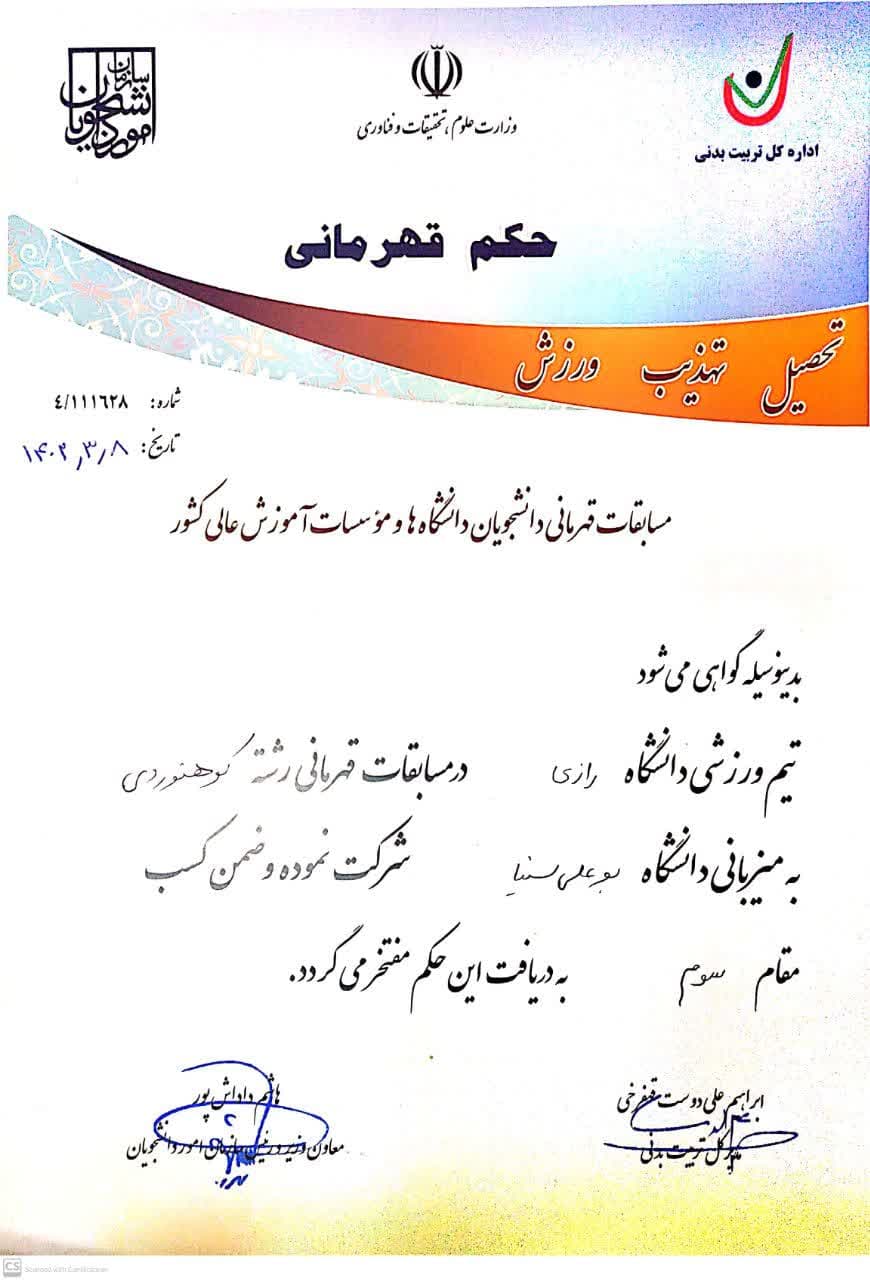 تیم کوهنوردی دانشجویان دختر دانشگاه رازی در مسابقات قهرمانی دانشگاههای کشور موفق به کسب مقام سوم تیمی و مقام اول سرعت شد.