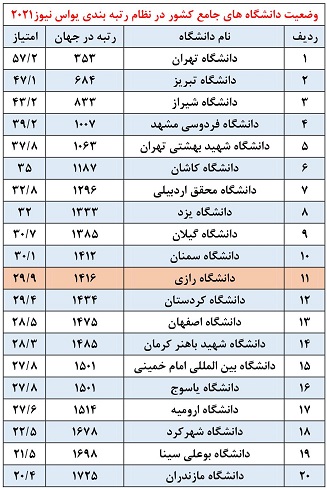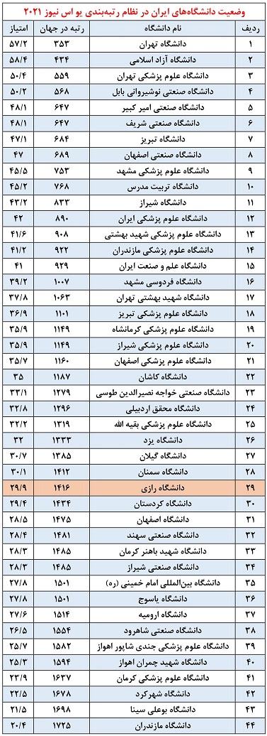 معاون پژوهش و فناوری دانشگاه افزود: در این لیست، نام 44 دانشگاه از ایران نیز به چشم میخورد که دانشگاه رازی رتبه 29 در بین کلیه دانشگاههای کشور و رتبه 11 در بین دانشگاههای جامع را بدست آورده است.