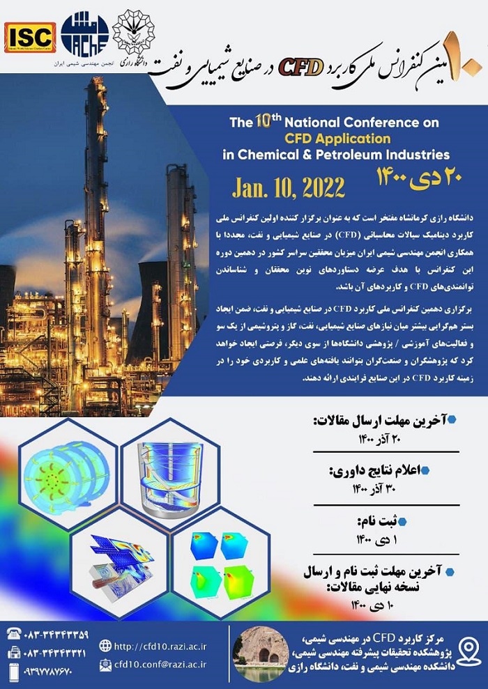 «دهمین کنفرانس ملی کاربرد CFD در صنایع شیمیایی و نفت» به میزبانی دانشگاه رازی و توسط پژوهشکده تحقیقات پیشرفته و گروه مهندسی شیمی و نفت برگزار میشود.