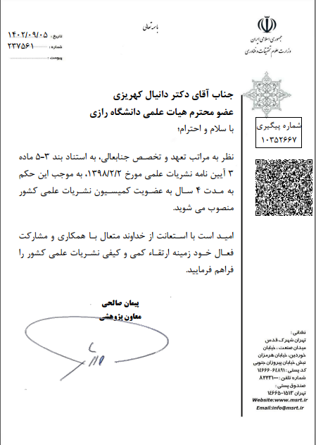 طی صدور حکمی از سوی معاون پژوهشی وزارت علوم تحقیقات و فناوری، دکتر دانیال کهریزی عضو هیأت علمی دانشگاه رازی برای مدت ۴ سال به عضویت کمیسیون نشریات علمی کشور منصوب شد.