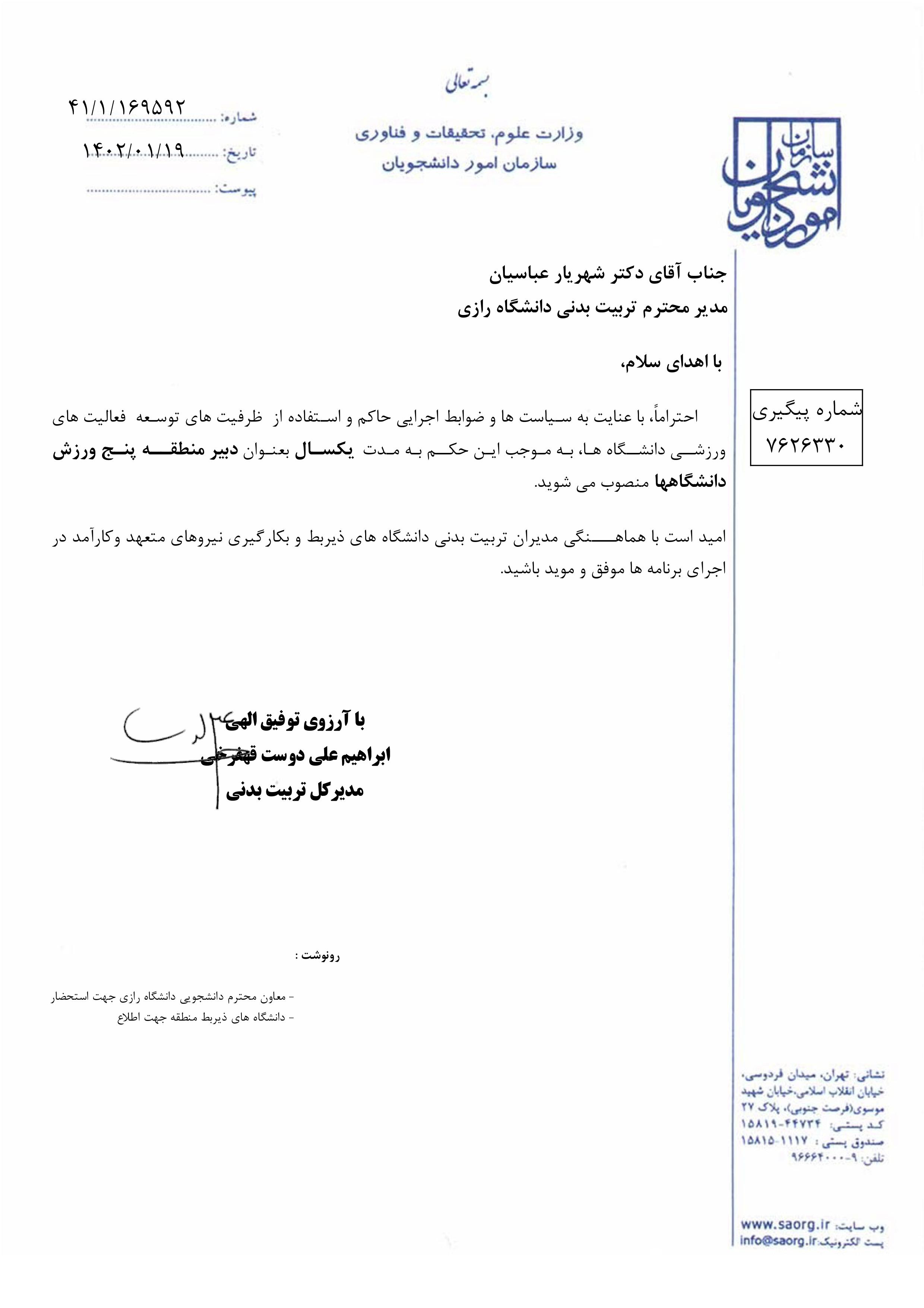 دکتر شهریارعباسیان مدیر تربیت بدنی دانشگاه رازی بـه مـدت یکسـال بهعنوان دبیرمنطقـه پنـج ورزش دانشگاهها منصوب شد.