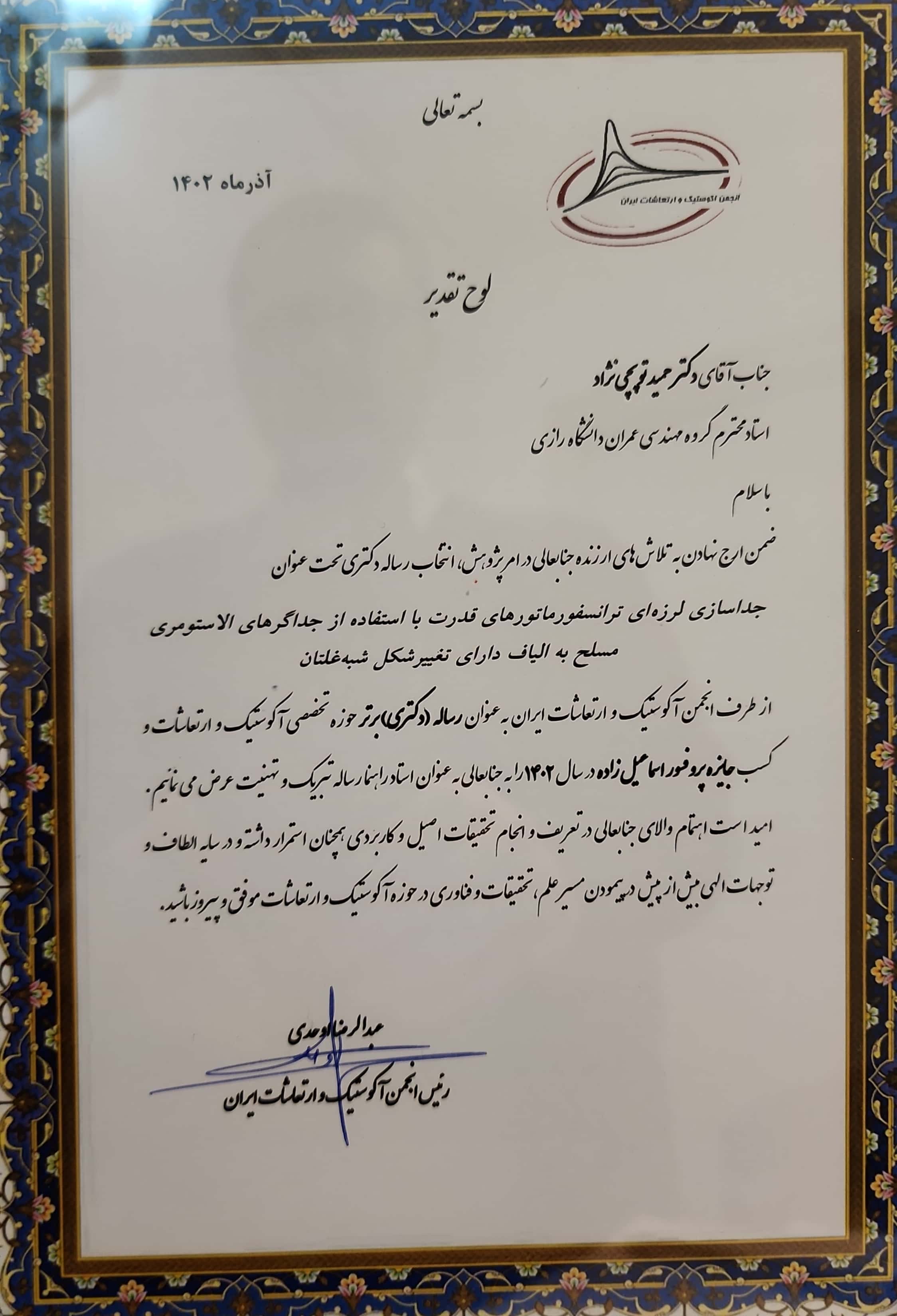 رساله دانشآموخته دانشگاه رازی از سوی انجمن آکوستیک و ارتعاشات ایران بهعنوان رساله برتر کشور در حوزه آکوستیک و ارتعاشات انتخاب شد.