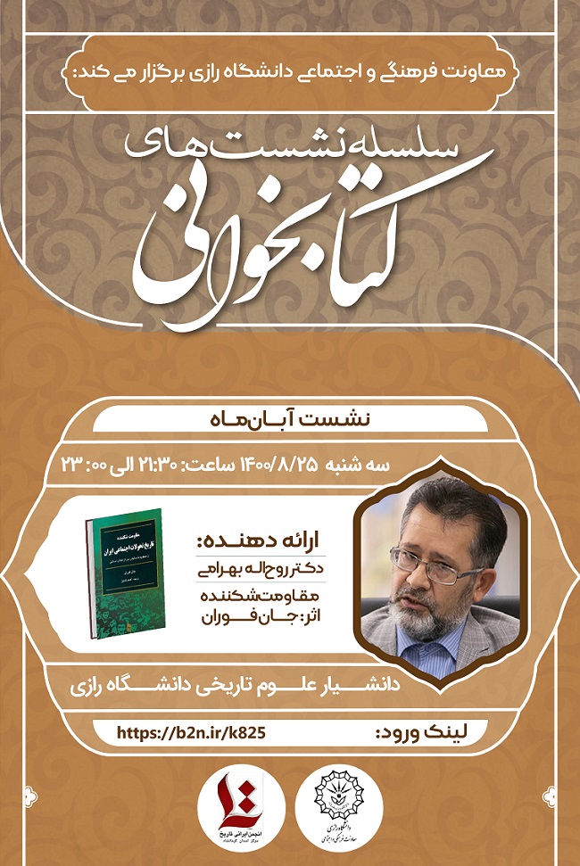 هشتمین نشست کتابخوانی و نقد و بررسی کتاب با بررسی و گزارش کتاب «مقاومت شکننده (تاریخ تحولات اجتماعی ایران: از صفویه تا سالهای پس از انقلاب اسلامی)» اثر «جان فوران» توسط آقای دکتر روحاله بهرامی (دانشیار علوم تاریخی دانشگاه رازی) به صورت مجازی برگزار میشود.
