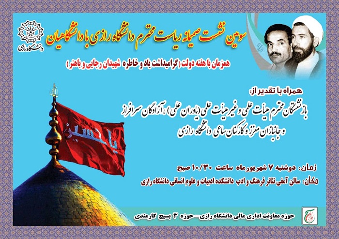 سومین نشست صمیمانه ریاست محترم دانشگاه با خانواده بزرگ دانشگاه رازی در روز دوشنبه مورخ ۷ شهریور ماه 1401 ساعت 10:30 صبح در سالن آمفی تئاتر فرهنگ و ادب دانشکده ادبیات و علوم انسانی برگزار می گردد.