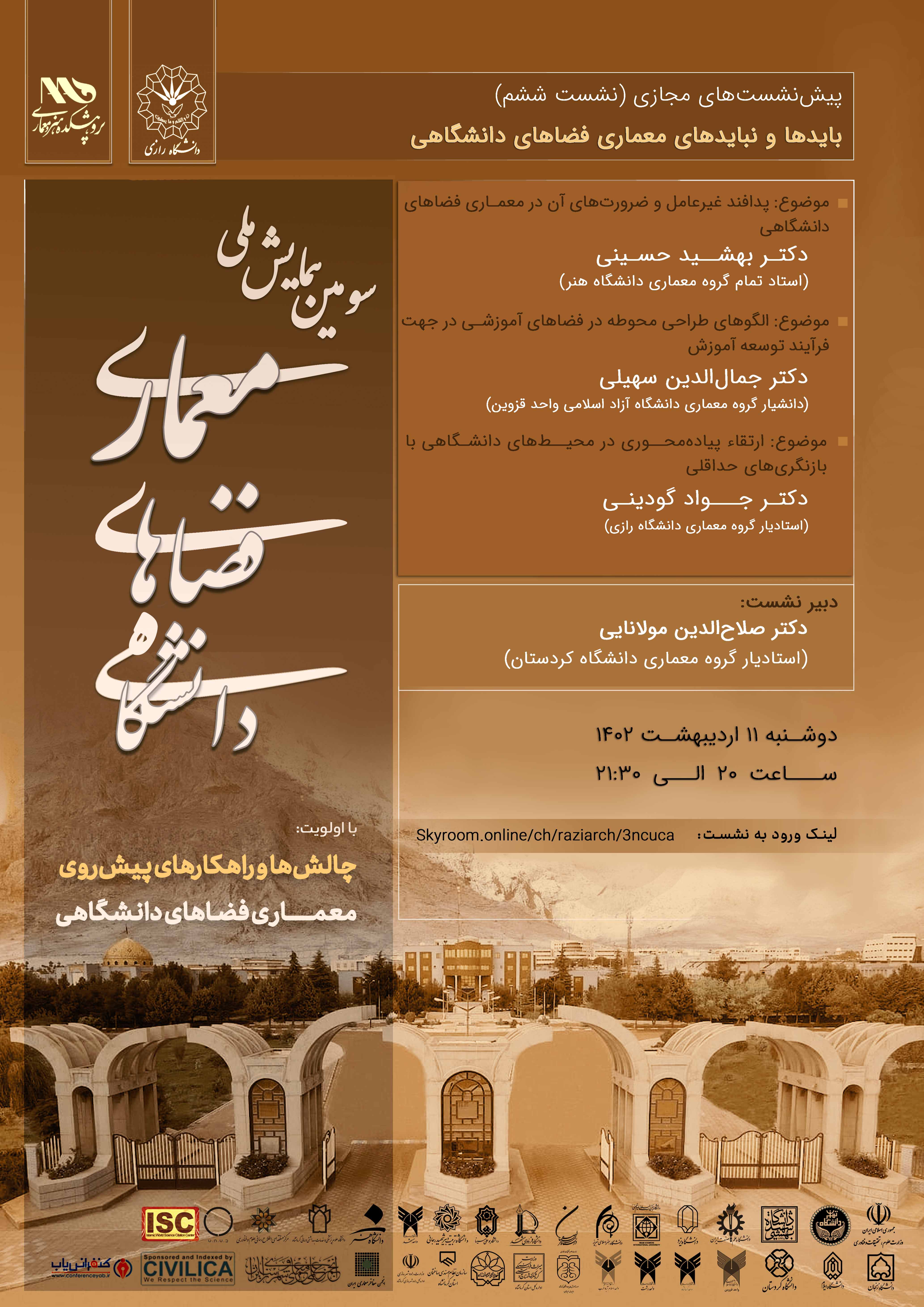 به گزارش روابط عمومی دانشگاه رازی، دبیرخانه سومین دوره همایش ملی «معماری فضاهای دانشگاهی»، میزبان شما علاقهمندان در ششمین پیشنشست این همایش است.