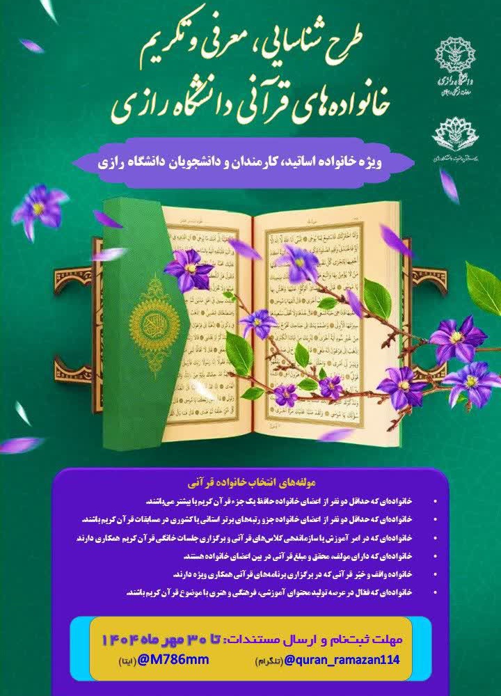 طرح شناسایی، معرفی و تکریم خانوادههای قرآنی ویژه خانواده اساتید، کارمندان و دانشجویان دانشگاه رازی برگزار میشود.