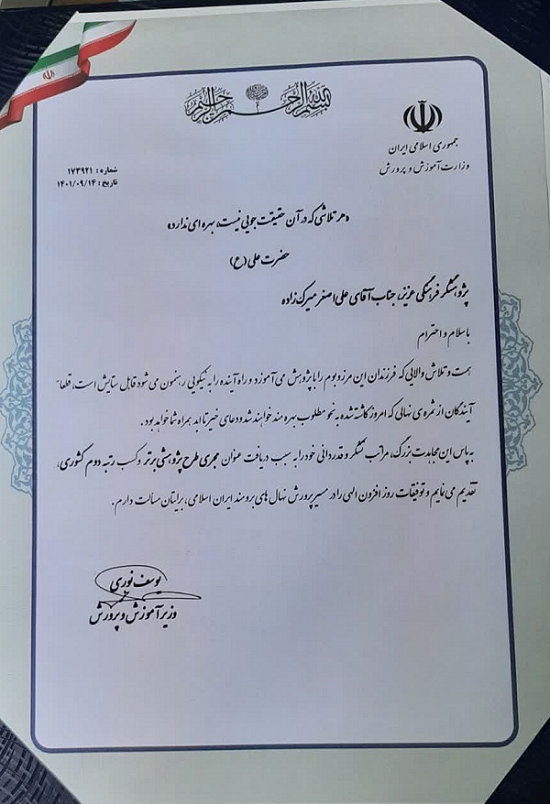 به گزارش روابط عمومی دانشگاه رازی به نقل از معاونت پژوهش و فناوری دانشگاه، طرح پژوهشی دکتر علیاصغر میرکزاده، عضو هیأت علمی گروه ترویج و آموزش کشاورزی پردیس کشاورزی و منابع طبیعی با عنوان " واکاوی رفتار زیست محیطی دانشآموزان ابتدایی استان کرمانشاه و ارائه بسته نیازسنجی آموزش زیست محیطی برای آنان" که با همکاری دکتر احسان خسروی و دکتر فرانک کرمیان در سالجاری به اتمام رسیده است، از سوی پژوهشگاه مطالعات آموزش و پرورش به عنوان طرح پژوهشی برتر کشوری در سال 1401 معرفی و در 20 آذر ماه از سوی دکتر یوسف نوری، وزیر آموزش و پرورش مورد تقدیر قرار گرفت.