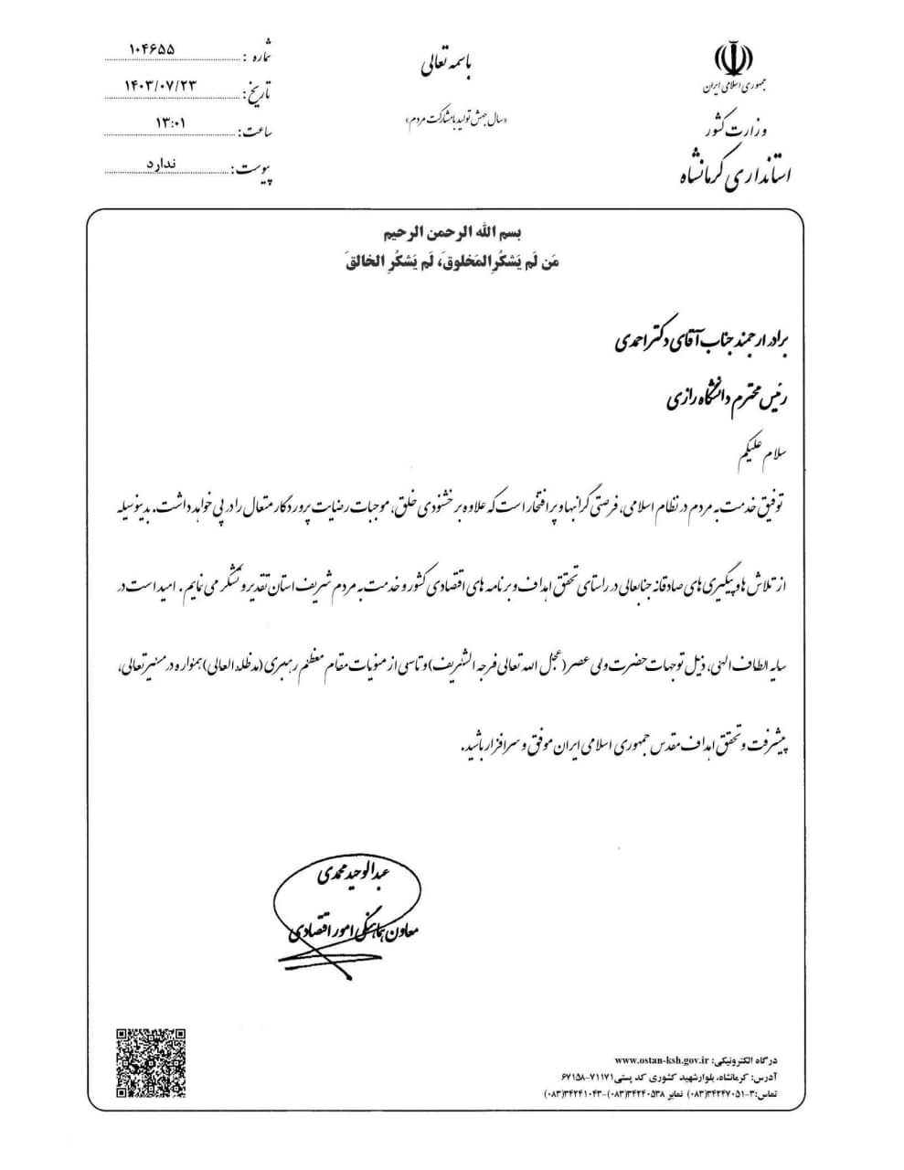 به گزارش روابط عمومی دانشگاه رازی، در نامه معاون هماهنگی امور اقتصادی استانداری آمده است: