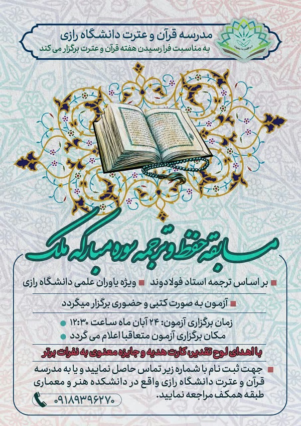 مدرسه قرآن و عترت دانشگاه رازی مسابقه حفظ و ترجمه سوره مبارکه مُلک (براساس ترجمه استاد فولادوند) ویژه کارکنان دانشگاه رازی را به مناسبت هفته قرآن و عترت دانشگاهها برگزار میکند.